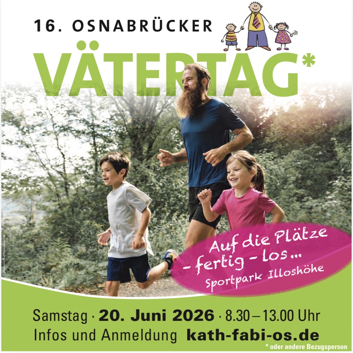 Schon zum 16. Mal findet der Osnabrücker Vätertag statt, der vom Familienbündnis Region Osnabrück gemeinsam mit zahlreichen Kooperationspartnern organisiert und durchgeführt wird.Unter dem Motto „Auf die Plätze, …fertig, …los!" laden wir alle Väter* herzlich ein, gemeinsam mit ihren Kindern im Alter von 5-12 Jahren einen unvergesslichen Tag voller Abenteuer zu erleben.Am 20.06.2026 ab 8.30 Uhr